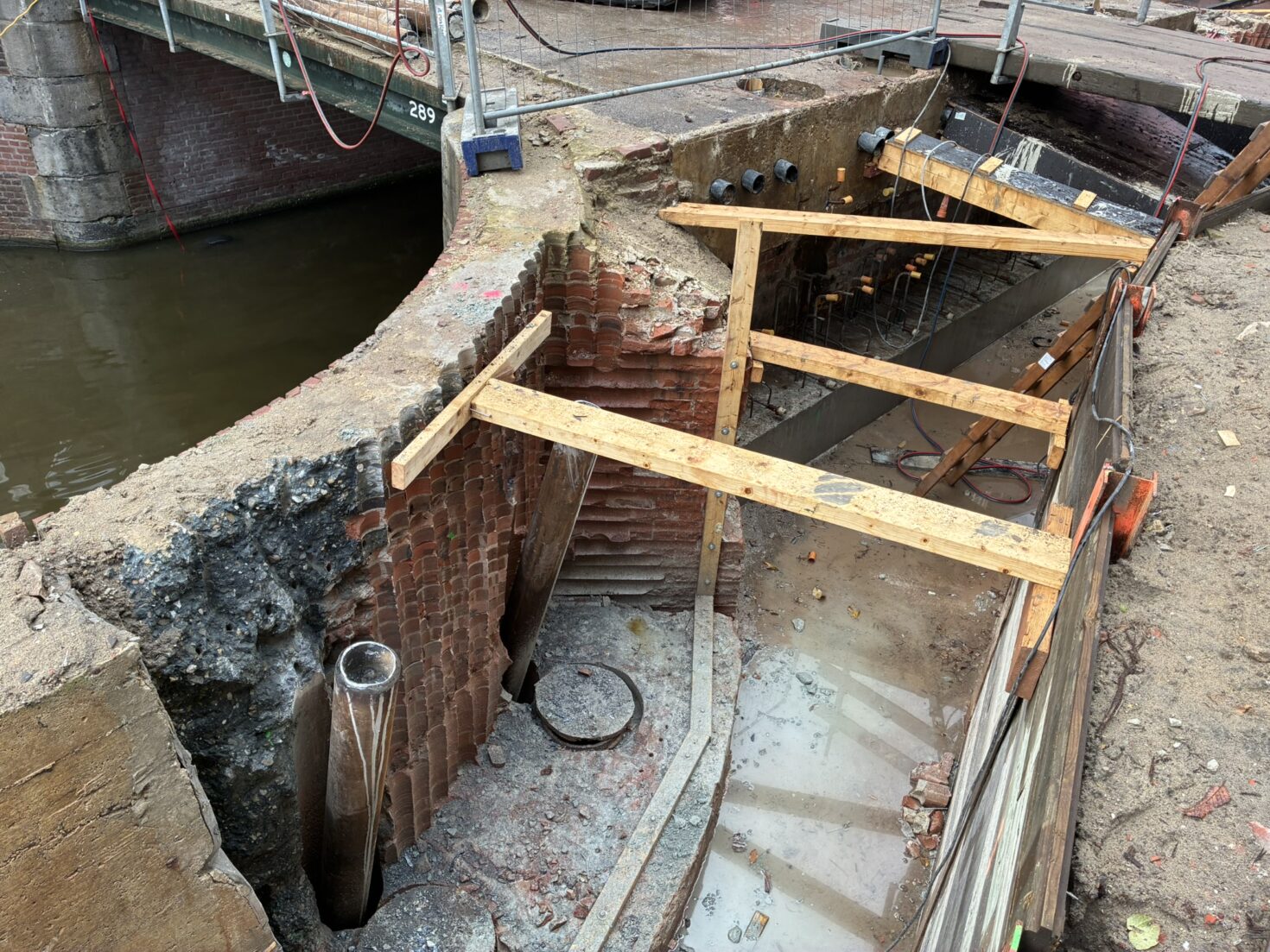 Er kwam wel flink wat extra werk bij: behalve de fundering van de brug moesten ze ook de vleugelmuren meenemen. Dat zijn de gebogen muren tussen het landhoofd onder de brug en de kademuur. “Het metselwerk van de vleugelmuren vormt 1 geheel met de landhoofden”, legt technisch manager Ramon Bleiji uit. “Als we de brug zouden versterken, maar de vleugelmuren niet, dan loop je het risico dat de vleugelmuren gaan hangen aan het dek, en zo langzaam hun structuur en stabiliteit verliezen.”