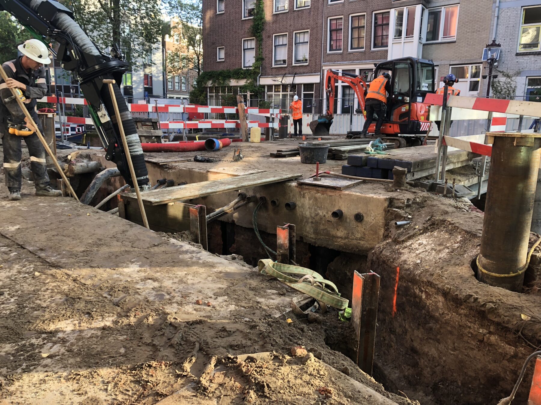 Om het werk te kunnen uitvoeren, moest er eerst een droge bouwkuip worden gemaakt, zodat ze achter de landhoofden en de vleugelmuren aan het werk konden. “Op zo’n krappe plek kan dat niet met grote damwanden”, vertelt Sven. Dus werd het een zogenaamde Berlinerwand. “Dat is een H-profiel van staal met houten schotten.” Maar met zo’n lichte bouwkuip loop je wel het risico dat de grond inzakt, je graaft tenslotte een behoorlijk diep gat naast de brug. “Dat hebben we opgelost met bodeminjectie om de bodem meer stabiliteit te geven”, vult Ramon aan.