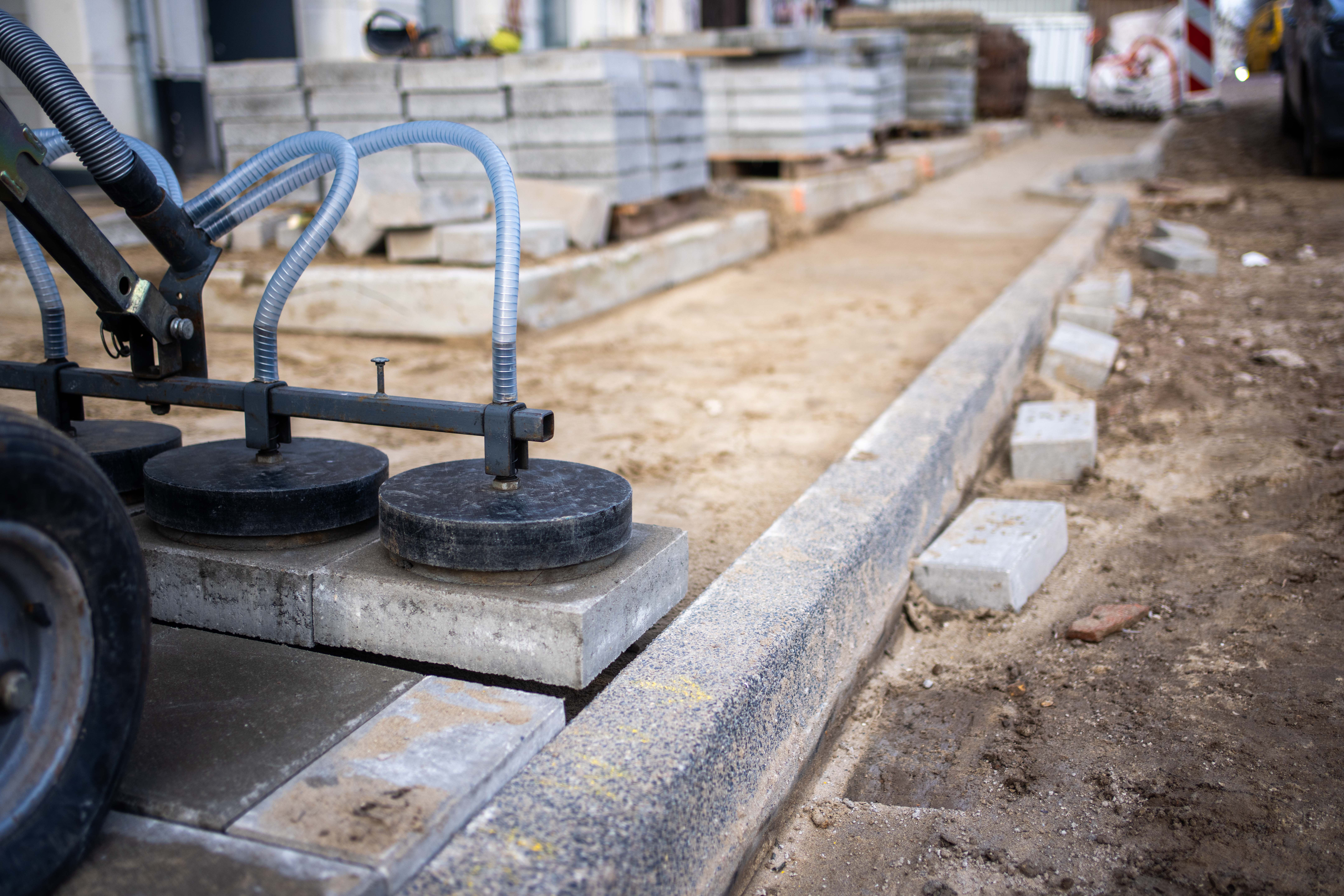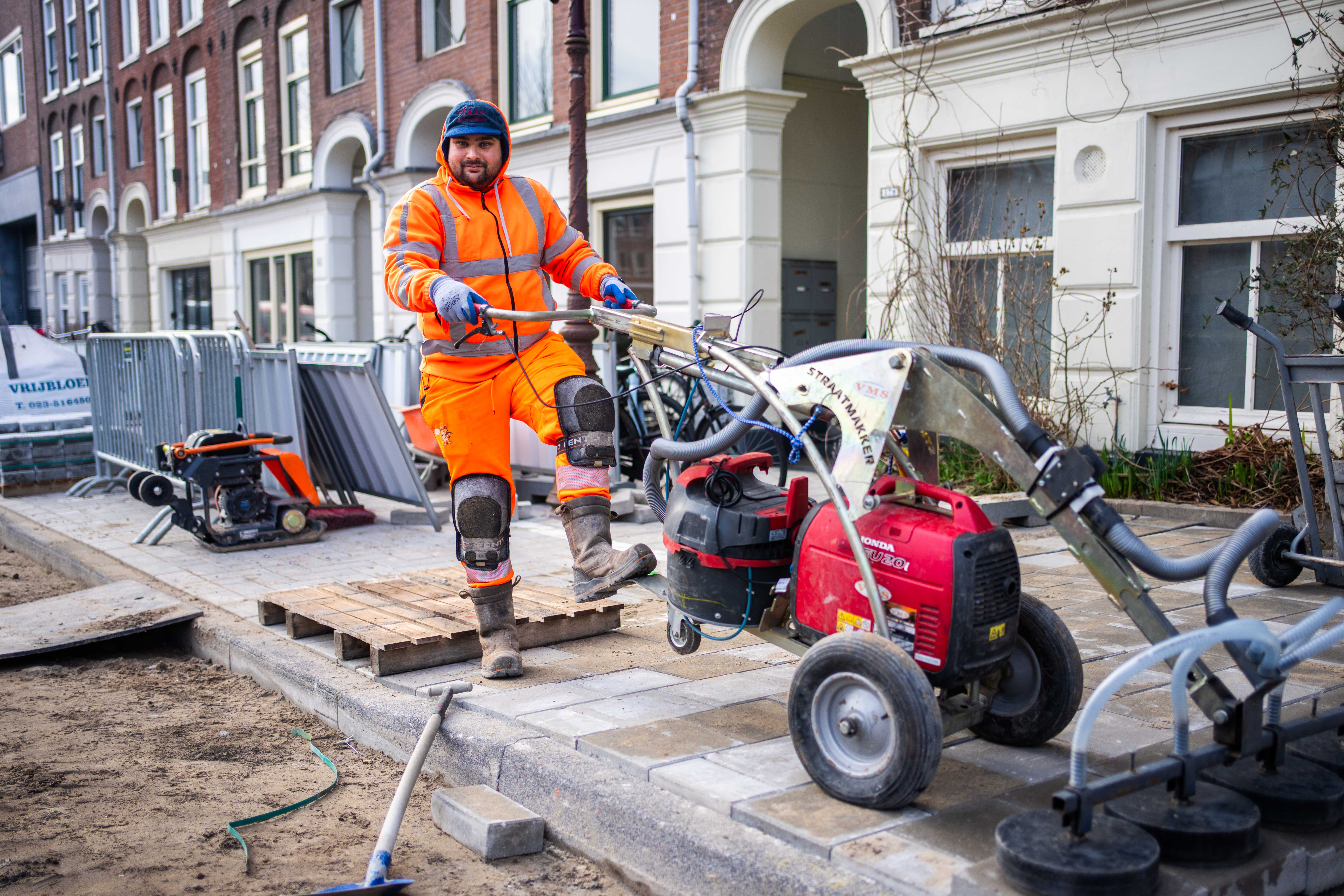 Denk je dat straten maken eenvoudig is, dan heb je het mis. Het duurt wel een jaar of twee voordat je weet hoe alles moet, vertelt Dennis tussen het werken door. Hij leerde het vak van collega’s met veel ervaring, en door zijn ogen en oren goed open te houden. Werken met de Straatmakker bijvoorbeeld, dat is niet eenvoudig. Van een afstandje ziet dat apparaat eruit als een grote grasmaaier, met een elektrische motor, 4 grote vacuümzuignappen en een handvat. De zuignappen tillen de tegels op, Dennis manoevreert de Straatmakker naar de juiste plek en laat ze dan weer zakken. Cemil: “Als we hiermee werken, duurt het wat langer dan op de ouderwetse manier, maar je spaart je rug. Deze tegels wegen 17 kilo per stuk, die moet je niet zelf op hun plek willen leggen.” Mag ook niet meer volgens de Arbo-regels, zegt Emre, collega van Dennis. “De inspectie zit er bovenop. Als we de apparatuur niet gebruiken, krijgt de aannemer daar opmerkingen over. Allemaal om ons te beschermen, want straten maken is een zwaar vak.”